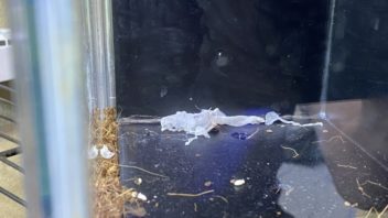 そして帰宅して晩ご飯を食べてから生き物達のお世話です。ヤモリ達の飼育ケージを見てみると、脱皮の皮が転がっていました。(´┏┓`)