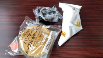 お昼休みはパンケーキとアメリカンドッグです。食後のデザートはまっくろココアチーズケーキ。(´・ω・`)