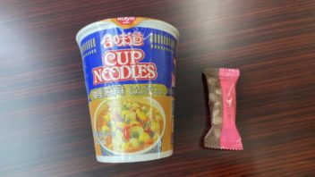 お昼休みは台湾旅行に行っていたN村さんにお土産でいただいたシーフードカレーヌードルです。あと、ヌガーというお菓子。初めて食べました。(´・ω・`)