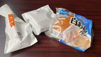お昼休みは家から持って来た白あんパンとセブンイレブンで買って来た諸々です。