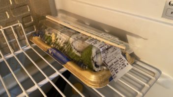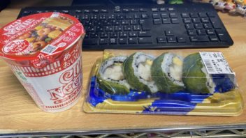 そしてお風呂に入ってから晩ご飯です。会社から持って帰って来た巻き寿司と部屋にストックしていたカップヌードル。( ´_ゝ`)