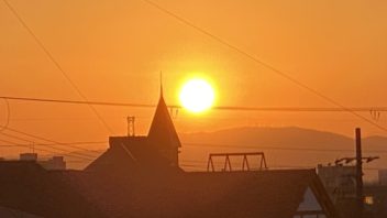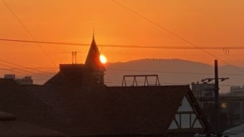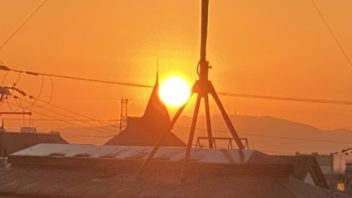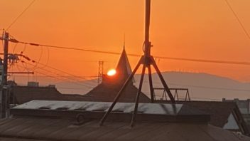 次は部屋からのご来光です。宝塚市は7時6分に日の出のようです。窓を開けてスタンバイ。例によってアンテナとか建物とか電線が邪魔ですが。( ´_ゝ`)