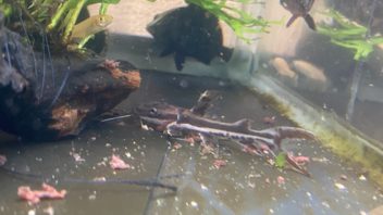 そして次はニホントカゲの幼体達とニホンカナヘビにご飯です。カルシウムパウダーを塗したミルワームを餌皿に入れて置いておきました。