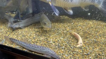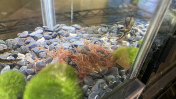 そして帰宅して生き物達のお世話です。アカメ&タイガーショベルノーズキャットの水槽を見てみると、昨日入れた冷凍赤虫がそのまま残っていました。食べてないのか・・・。(´・ω・`)