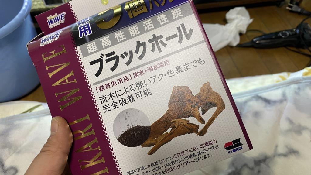 なので、余っていたブラックホールをフィルターに入れる事にしました。以前イモリ水槽の水が流木のアクで色付いてしまった時にブラックホールを入れたら速攻でクリアな水になったんですよね。
