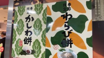 御座候に行くと、10人ぐらい並んでいました。そしてよく見ると、季節限定のわらび餅とかしわ餅を売っていました。御座候以外にもこんなの売ってるんだ・・・。(´・ω・`)