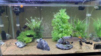 さっきシルバーシャークを入れたアカメ&タイガーショベルノーズキャット水槽ですが、潜水艦の挙動がおかしいです・・・。新参者がストレスになってしまっているのか・・・。なので、シルバーシャークを熱帯魚水槽に移しました。