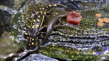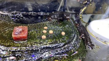 そしてイモリ達にもご飯ですが、最近陸場に上がっていて水中にいない事が多いので、陸場に餌をおいてみました。