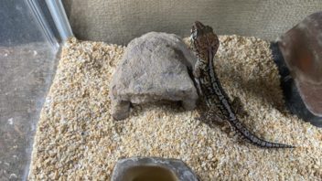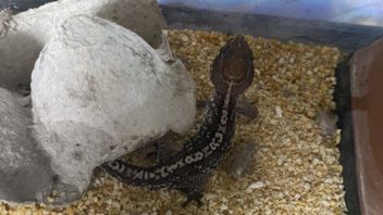 そして生き物達のお世話ですが、ソメワケササクレヤモリ達の飼育ケージの床材が凸凹になっていました・・・。これは産卵したのかと思って掘り返してみたんですが、卵はありませんでした。(´・ω・`)