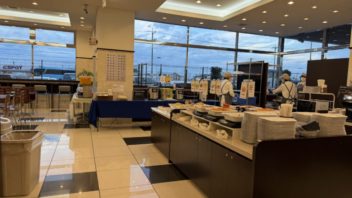 そして6時半から朝食サービスなので、もそもそと着替えて15分前にロビーに行きました。一番乗りで並びました。(*´∀`)
