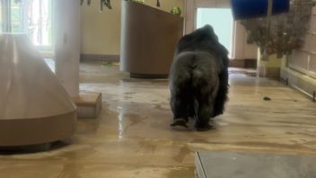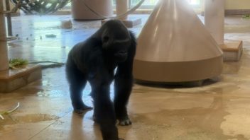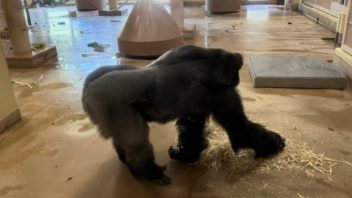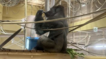 ゴリラは屋外だけではなく屋内にもスペースがあって繋がっているみたいです。なので、屋内に行ってみると、人だかりが(汗)。