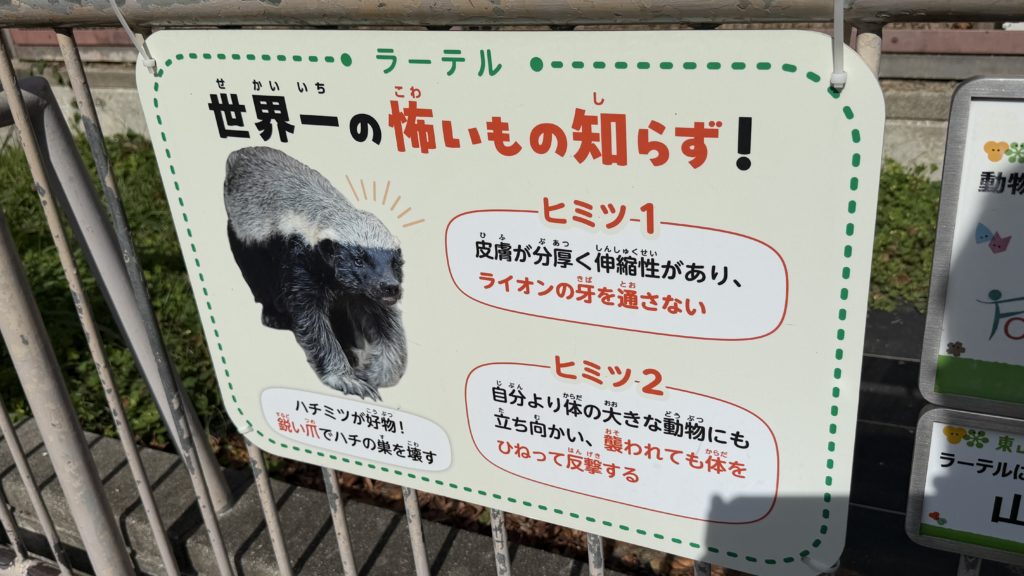 すると、最強生物のラーテルがいました。日本では東山動植物園でしか見られないそうです。