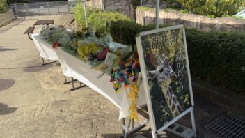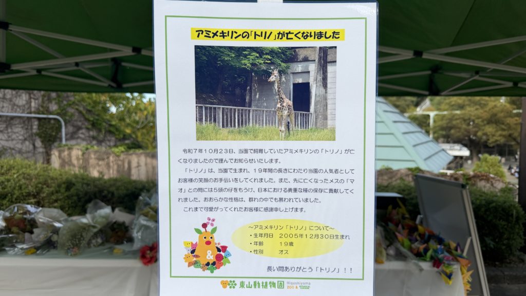 すると、献花台が・・・。そう言えば先日ニュースでキリンのトリノが亡くなったとやっていましたね・・・。6日前か・・・。(´;ω;`)