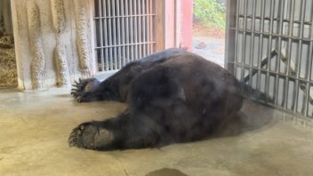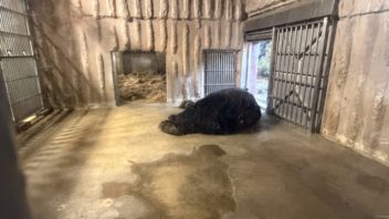 すると、屋内スペースにヒグマが寝転んでいました。デカい(汗)。(;´Д`)
