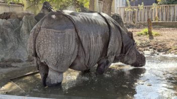 サイのところまで戻って来たら、サイが間近に来て水浴びをしていました。