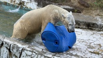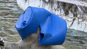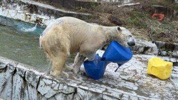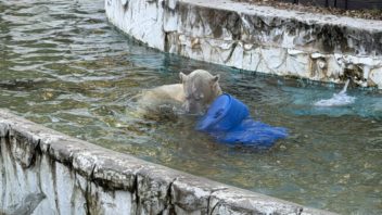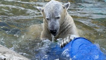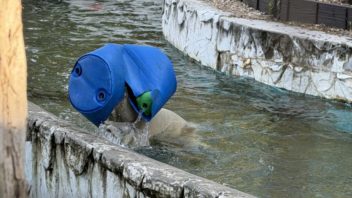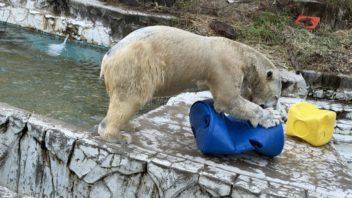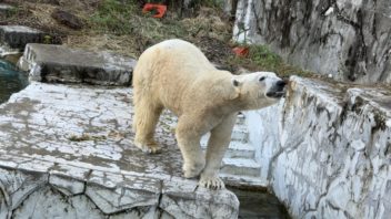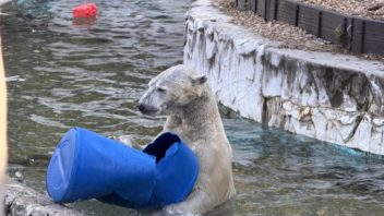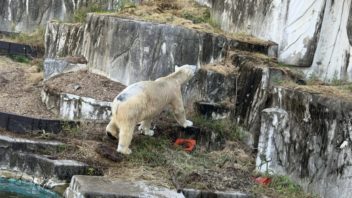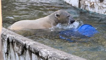 ホッキョクグマ舎の前を通ると、激しい人だかりが。行ってみると、ホッキョクグマが水遊びをしていました。