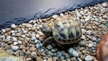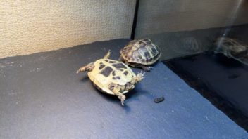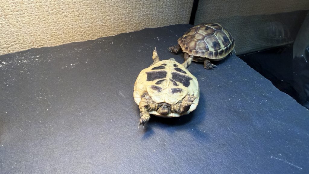 一段落したところで、昨日お迎えしたヒガシヘルマンリクガメ達の様子を見てみると、マン丸がひっくり返っていました(汗)。何故こんな何も無い場所で・・・。(;´Д`)