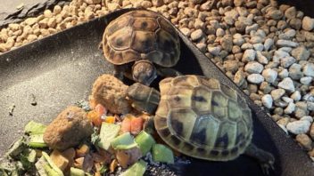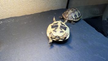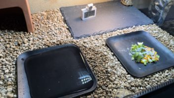 とりあえずヒガシヘルマンリクガメ達の水入れと餌入れを替える事にしました。ついでに餌もあげよう。(´・ω・`)
