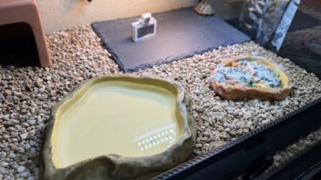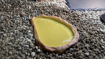 ・・・が、水入れがめっちゃ水を弾きます(汗)。何か撥水加工されているっぽいです・・・。なので、水入れは元に戻しました。段差を解消する為に床材に埋めておきました。