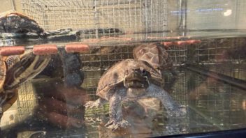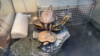そしてお風呂に入って日記を書いていたんですが、ミズガメ達が集団で折り重なってバスキングしていました(汗)。やはり陸場の面積が小さ過ぎるな・・・。もっと広い飼育ケージにしてあげたいな。(;´Д`)