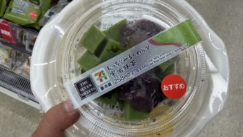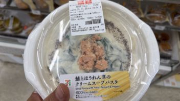 お昼休憩はセブンイレブンに行きました。鮭とほうれん草のクリームスープパスタと宇治抹茶のわらび餅を買いました。
