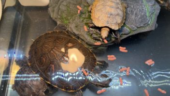 そして生き物達のお世話です。リクガメ達とミズガメ達にご飯をあげました。
