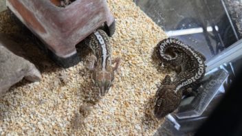 それはそうと、昨日のコオロギの残りをストックしていたんですが、バタバタと死に始めていました・・・。なので、全滅する前に使ってしまう事に。ソメワケササクレヤモリ達とアマガエル達に与えました。(´・ω・`)