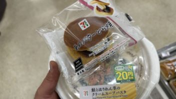 お昼ご飯は20円引きの鮭とほうれん草のクリープパスタです。あと、食後のデザートにあんバターどら焼です。やはりあんバターどら焼が美味い。(*´∀`)