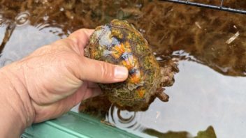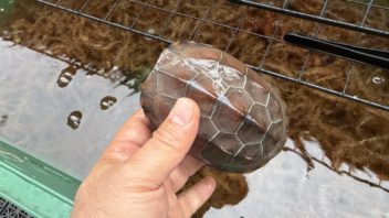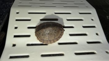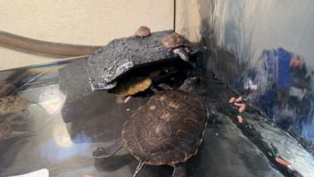 そしてミズガメ達の水槽に導入しました。ダントツでサイズが小さいので、いじめられないかしばし観察です。兜丸と命名。(´・ω・`)