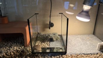 なので、余っている15cmキューブ水槽でもう少し大きくなるまでしばらく単独飼育する事にしました。・・・が、バスキングライトが余っていません・・・。なので、リクガメ達の飼育ケージの中に水槽を置きました。ここならバスキングライトもあるし、スレートプレートがパネルヒーター代わりになるのでなんとかなりそう・・・かな・・・?(´・ω・`)