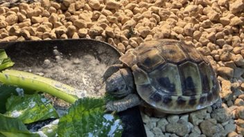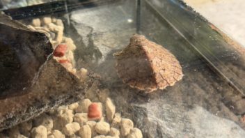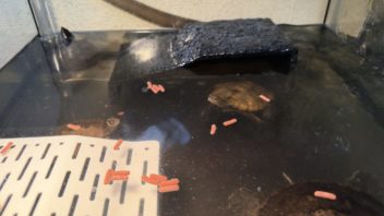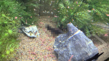 そして兜丸にご飯です。半分に割ったカメプロスプレミアムを与えているんですが、今日もちゃんと食べているのを確認出来ました。たくさん食べて早く安心サイズに育って欲しい。(´・ω・`)