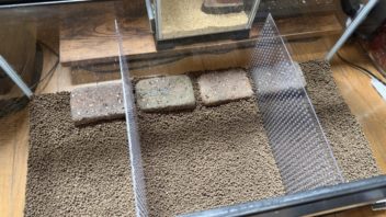 そしてアクリルのパンチボードで3つに仕切ってレンガブロックで固定します。