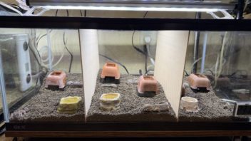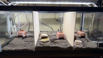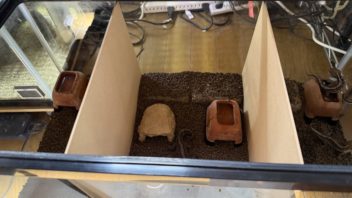 そしてソメワケササクレヤモリの飼育環境のセッティングですが、現在他にはナースとシューティングスターを入れているレプテリアブラック300Lowと、ナースとシューティングスターの子供達2匹を入れているグラステラリウムナノキューブがあるんですが、余っている60cm水槽を3つに仕切ってそこにみんな入れる事にしました。