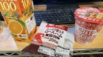 そして遅いお昼ご飯です。ハムとカップヌードルとオレンジジュース。( ´_ゝ`)