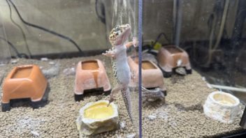 そして次はソメワケササクレヤモリ達ですが、ナースがササ美のスペースに侵入していました(汗)。アクリルとガラスの壁を登ったのか・・・(汗)。ナースは以前も網蓋を閉め忘れた時にガラスの壁を登って脱走した事があるんですが、趾下薄板が強力なんでしょうか・・・。(;´Д`)