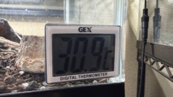 そしてお腹が空いたんですが、生体を持っているのでお昼ご飯は食べずに15時前に帰宅です。部屋に入ると、エアコンを切っていたのに暑い(汗)。各飼育ケージの温度も軒並み30℃前後になっていました。まあ爬虫類達にはちょうど良いんでしょうが。(´・ω・`)
