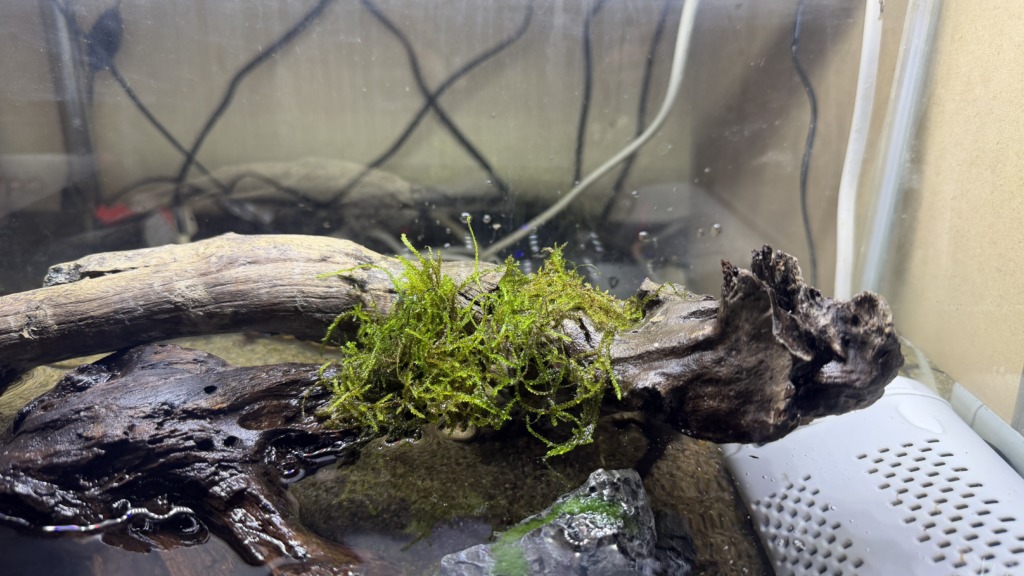 そしてイモリ達の水槽の流木に買って来たウィローモスを敷きました。見栄えが良くなる&流木を湿らせるのが目的です。糸とかで固定せずに置いているだけなんですが、活着してくれるでしょうか。(´・ω・`)